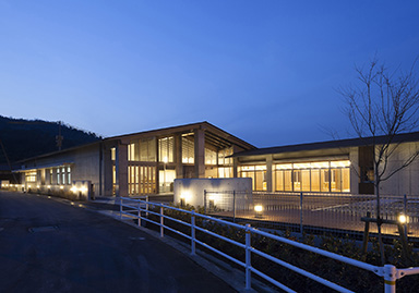 川の対岸や近傍を走るJR津山線からの景観は、大小の勾配屋根や緑の法面、落ち着いた色調で周辺環境との調和に配慮しています。