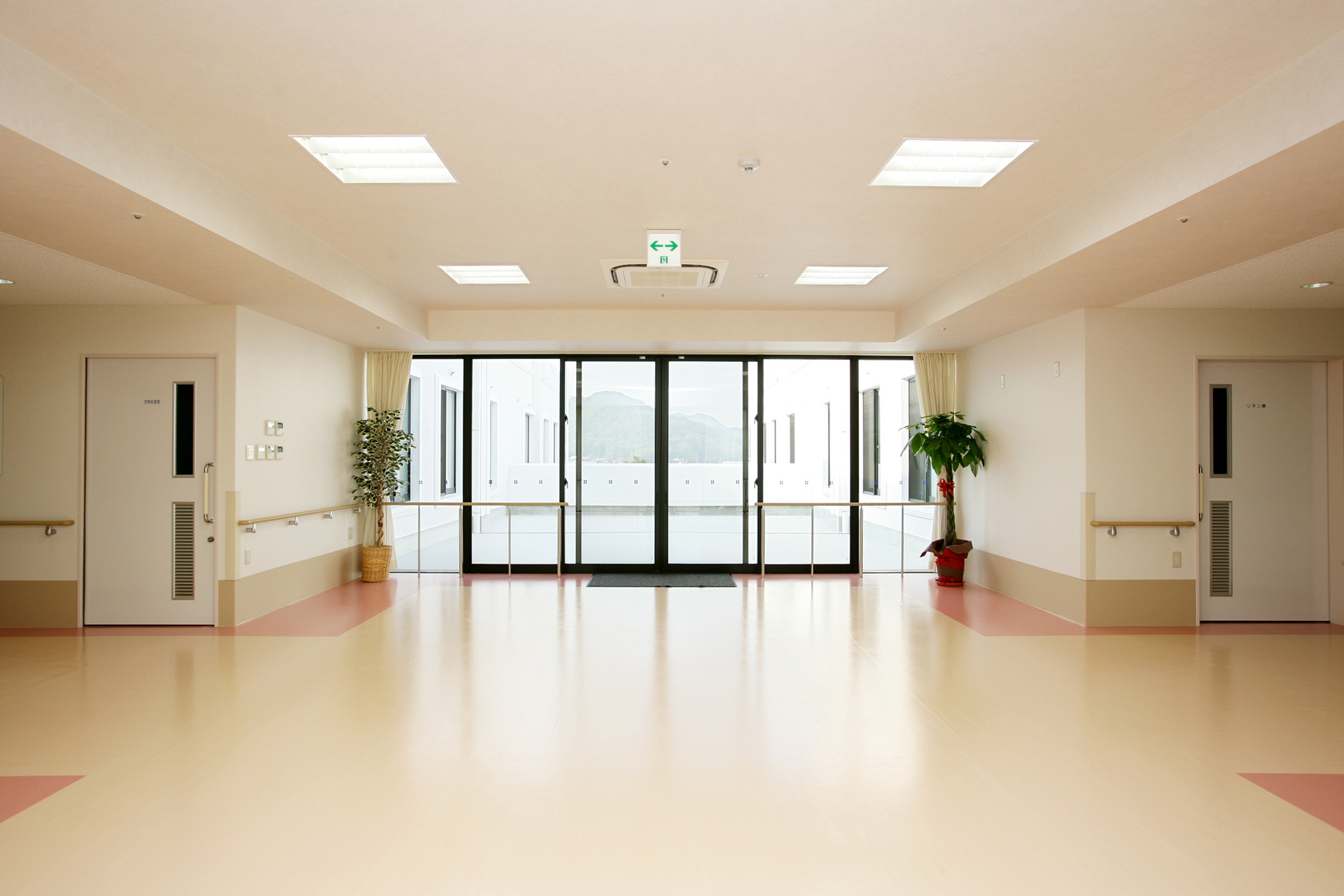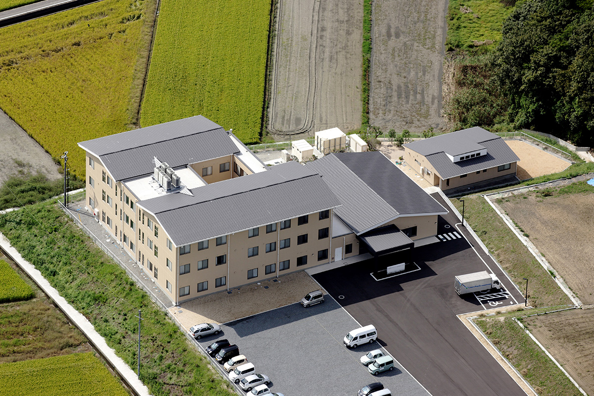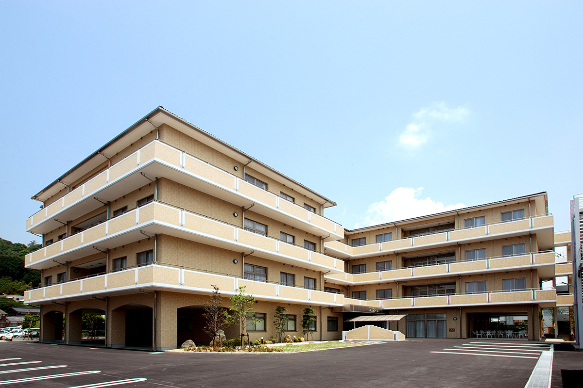 This is a general welfare facility for the elderly, consisting of a special nursing home, paid nursing home, etc. operated by the social welfare corporation "Fureai Fukushikai." The white exterior wall contrasts with the warm blue of the Seto Inland Sea and incorporates a masonry design, giving the impression of a Western-style building.