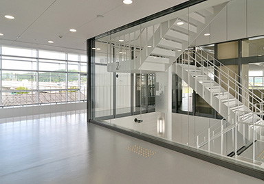 Outside, eaves are provided for maintenance to reduce the load on lighting and air conditioning, and to protect the building frame.