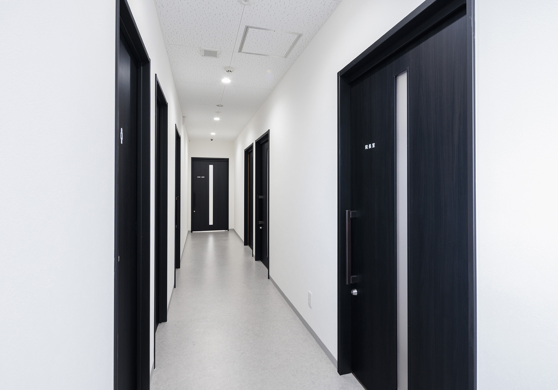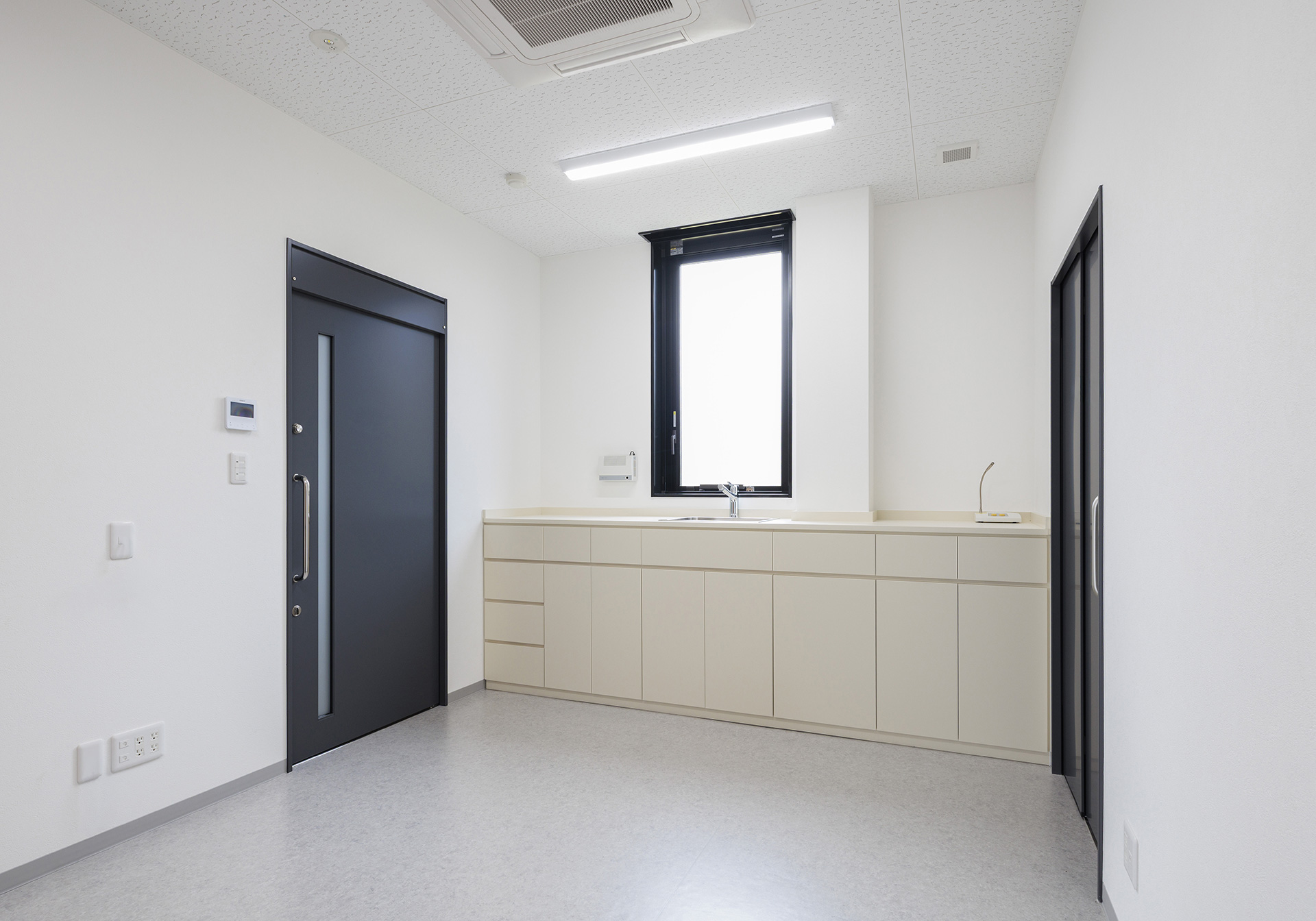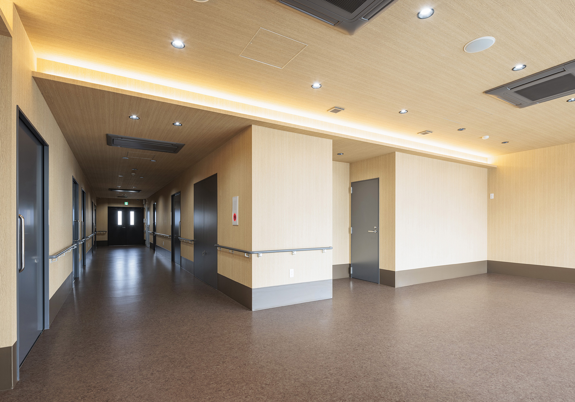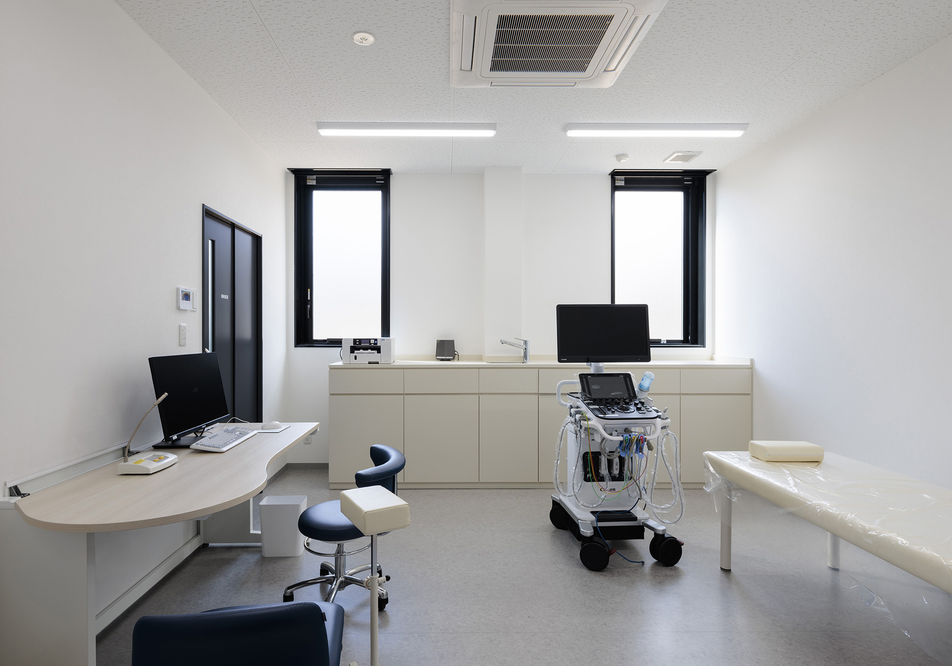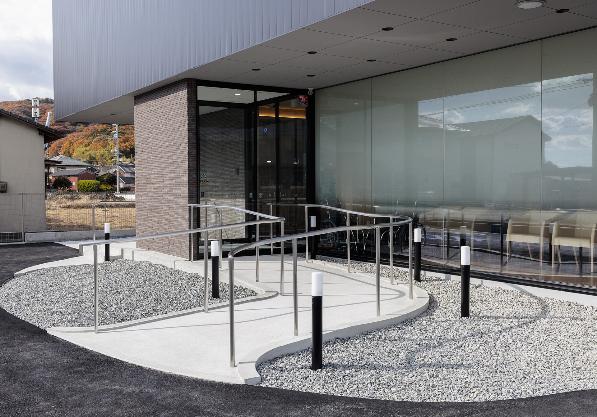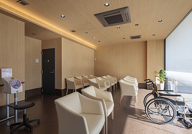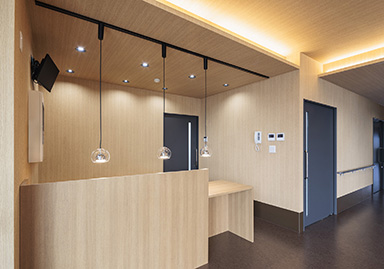 Aiming to provide community-based healthcare, this comprehensive clinic specializes in endoscopy, gastroenterology, and internal medicine, while also offering home visits. We prioritize creating an environment where patients feel at ease, achieving a space that combines functionality with warmth. The exterior features a calm color palette harmonizing with the surrounding nature, characterized by large windows that provide an open feel. Barrier-free design ensures comfortable access for everyone. The reception and waiting area features wood-grain accents in the interior design, with soft lighting and natural materials creating a pleasant atmosphere.