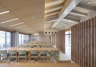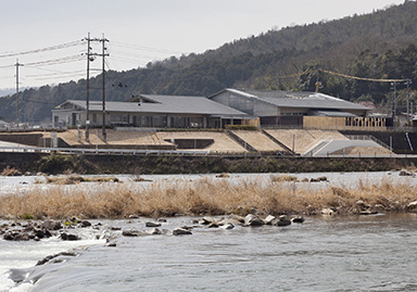 川の対岸や近傍を走るJR津山線からの景観は、大小の勾配屋根や緑の法面、落ち着いた色調で周辺環境との調和に配慮しています。