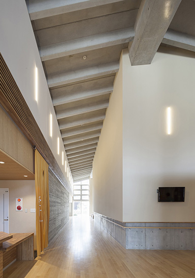 Against the south side of the site, the scale is adjusted by planting strips and eaves under the roof.